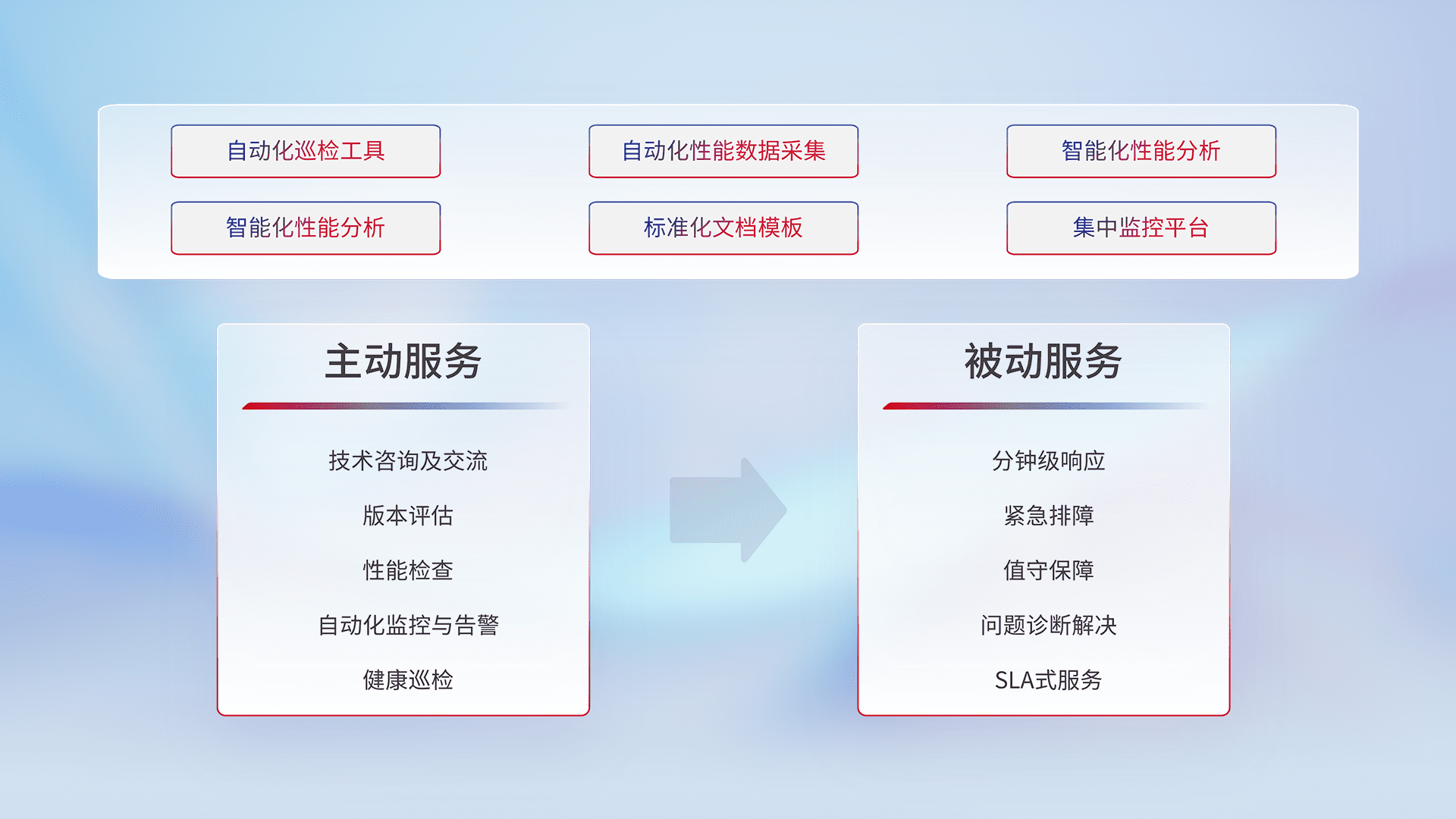 智能化工具和标准化文档,,,,保障服务质量,,,,提供主动服务(包含技术咨询、、版本评估、、、、性能检查、、、自动化监控与告警、、、、健康巡检)和被动服务包含(分钟级响应、、紧急排障、、、值守保障、、、问题诊断解决、、、SLA服务)。。。
