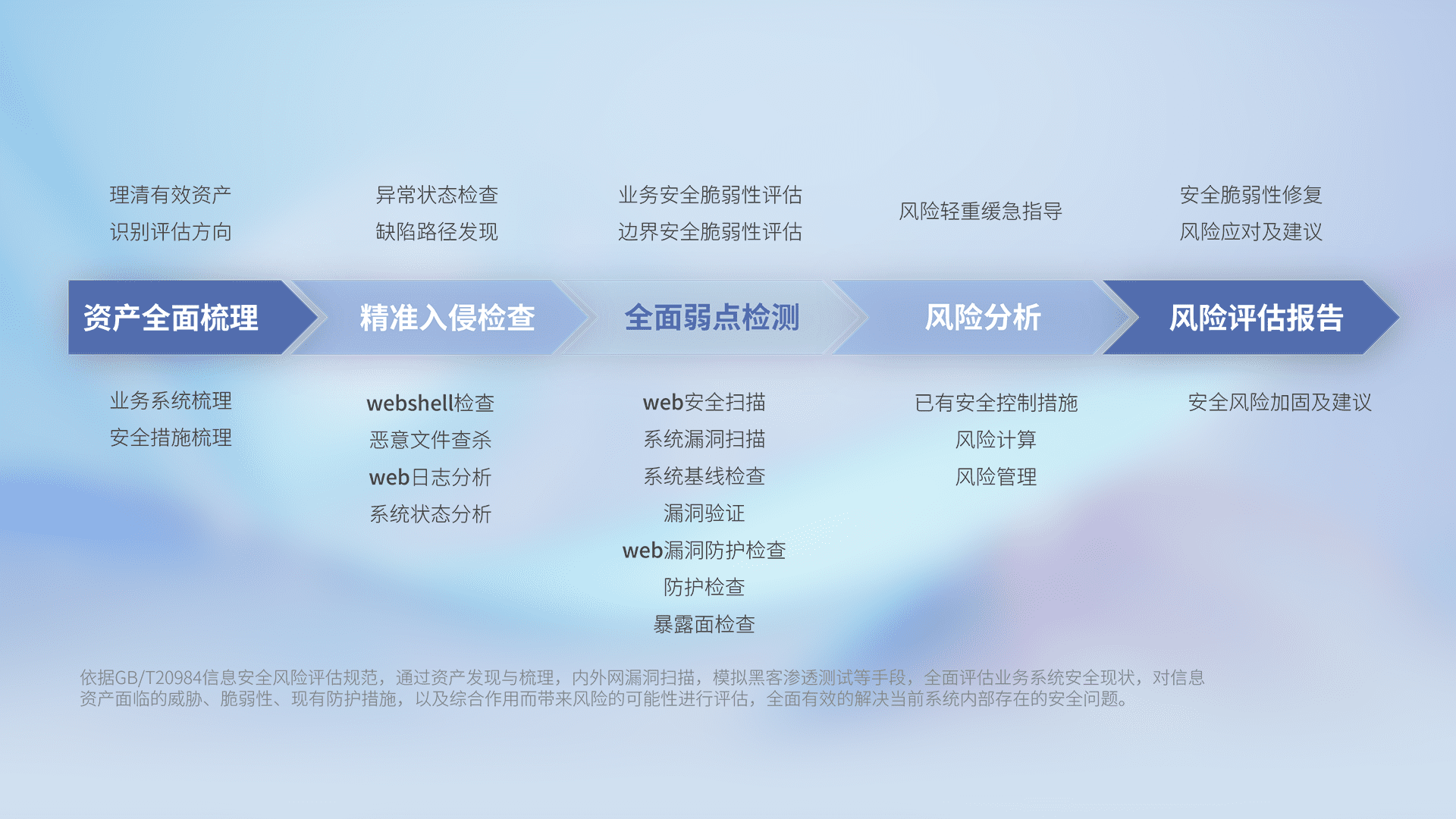 针对客户行业特性,,,,以专业的安全服务+多厂商联合解决方案提供专属的一站式安全管理服务,,,帮助客户全面感知网络空间威胁,,基于识别、、、检测、、、分析、、、防护、、监测、、、响应的服务理论模型,,,从方案咨询、、集成交付、、评估验证、、、、优化加固、、、运维运营,,致力于为客户提供完整的闭环管理式安全服务。。。以实战经验为客户打造高抵御风险的安全体系,,帮助客户发现威胁、、、对抗威胁、、、、处置威胁,,不断积累安全对抗能力,,,持续保障数字化安全。。